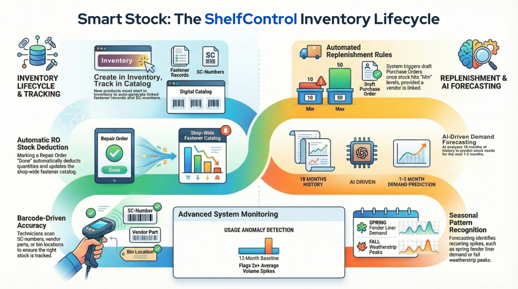ShelfControl introduces intelligent automation that moves beyond simple inventory tracking into full shop management. Features—Clip Identification, RO Auto‑Fill, Inventory Forecasting, Anomaly Detection, Vin Decoding, and an AI Chat Assistant—to streamline fastener work and repair order workflows. These tools help technicians and managers identify clips from photos, auto‑populate repair orders, analyze inventory trends, and detect unusual usage patterns.